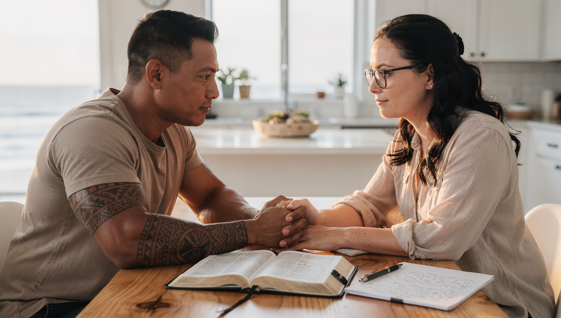 Cross cultural Christian couple praying and planning peaceful boundaries together.What your heart is really asking is: