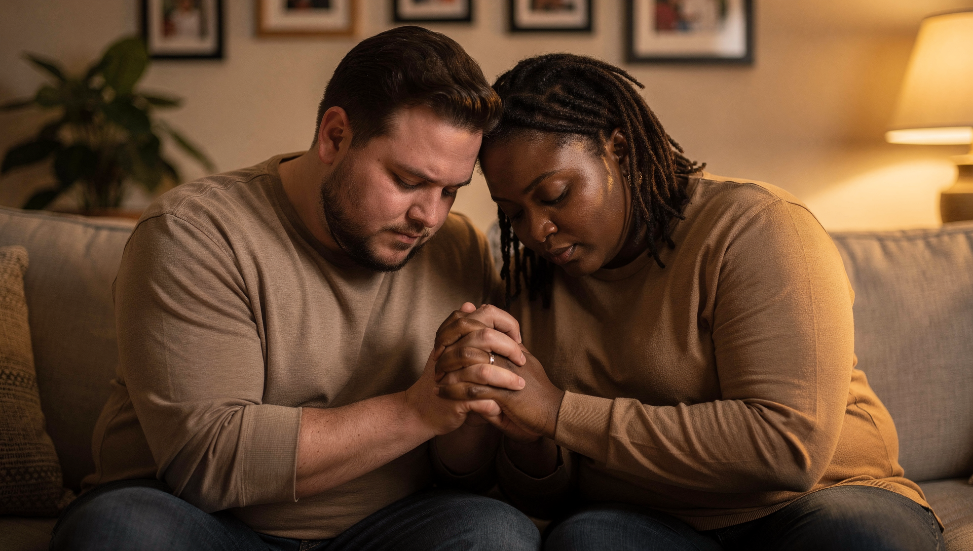 Cross-cultural Christian couple praying as they rebuild healthy respect after respect became control in marriage.